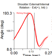 Defined manually by user in QTM software. In not defined manually, maximum value of pitching hand angular velocity is used. Note: If this event is not present, data will not be graphed in the report. |