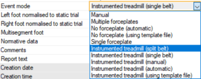 Event mode can be set to either "Instrumented treadmill (split belt)" or "Instrumented treadmill (single belt").