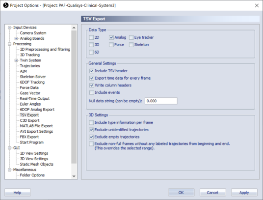 For the algorithm to work it is necessary to export analog signals to TSV files. To do so, open your project in QTM, go to > Project Options > Processing >TSV Export and on Data Type check Analog check box. Also check checkboxes for General settings as indicated in the picture.