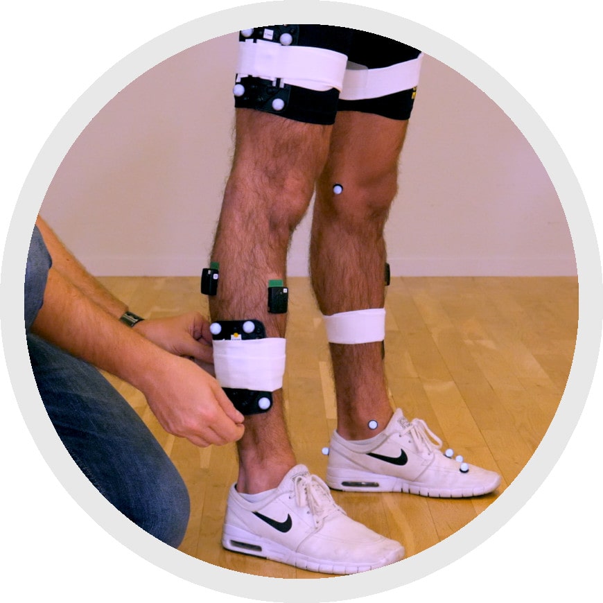 If you are using clusters, it is easiest to put them on the subject first so that you don’t have to worry about knocking other markers out of place in the process. Position the clusters on the subject’s legs, wrap the straps around as if applying a bandage, and Velcro them into place. Take care not to wrap over any of the markers.