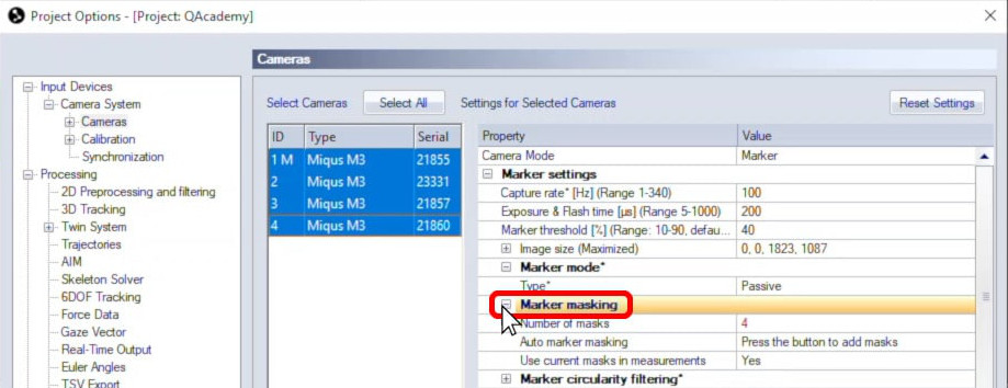 The marker mask tool in QTM lets you block unwanted reflections from the views of individual cameras.