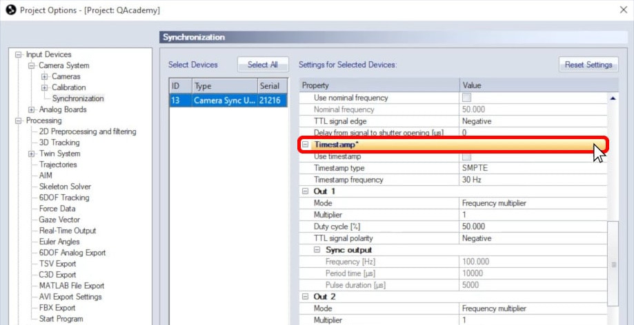 To access the synchronization settings, open Project Options (keyboard shortcut Ctrl+W) and navigate to “Input Devices” à “Camera System” à “Synchronization.”