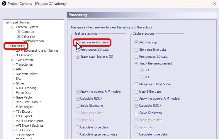 Then, open Project Options, navigate to “Processing,” and make sure that “Process every frame” is not selected and that only the necessary processing steps are enabled.