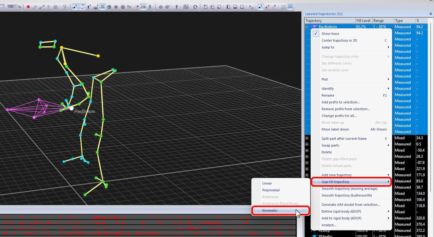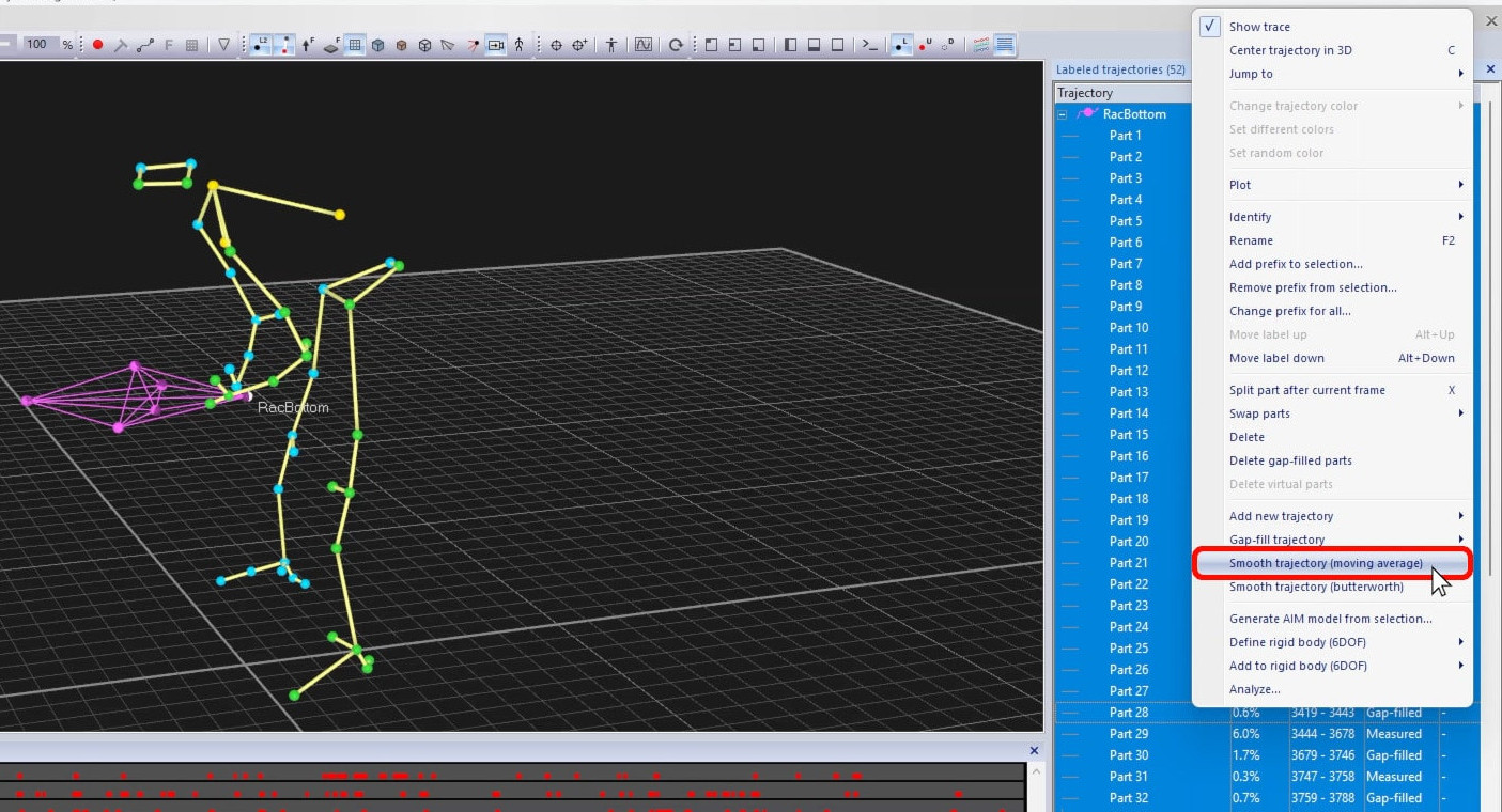 To quickly fill the gaps of selected trajectories or parts, right-click on your selection, choose “Gap-fill trajectory,” and pick a fill method.