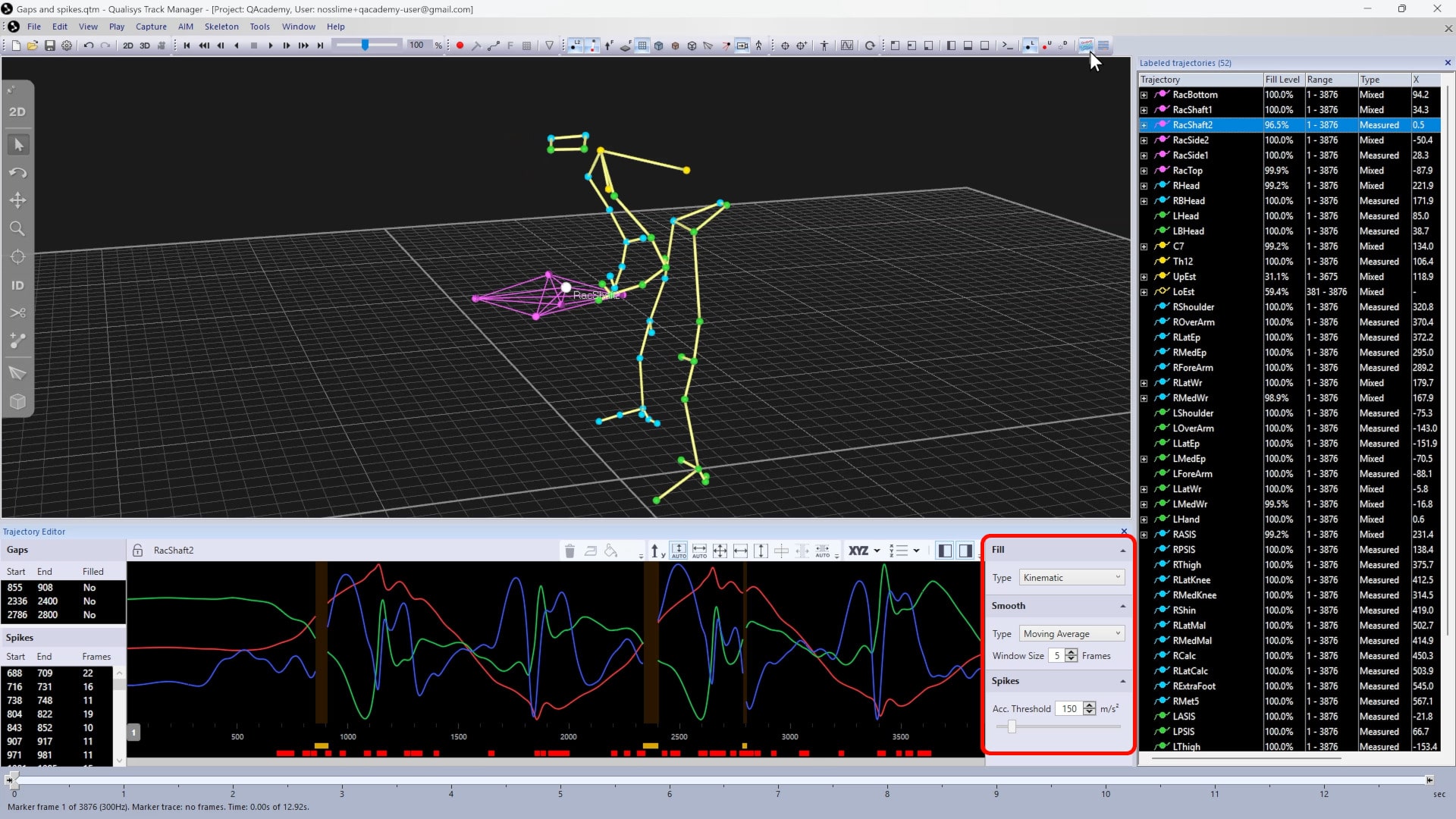 Gap-filling and smoothing tools are available to fix trajectories that have missing sections or abrupt spikes. Whether or not to use these functions depends on your application and how your data will be used outside of QTM. Note that any labeling errors should be corrected before you use these tools.