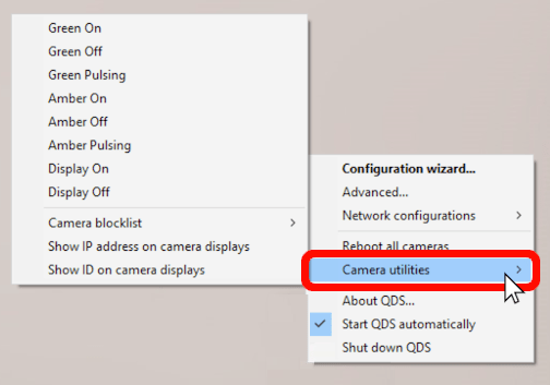 Clicking “Camera utilities” gives you options for controlling your camera displays and the color and behavior of their LED light rings. Note that the display commands will not apply to Miqus camera models.