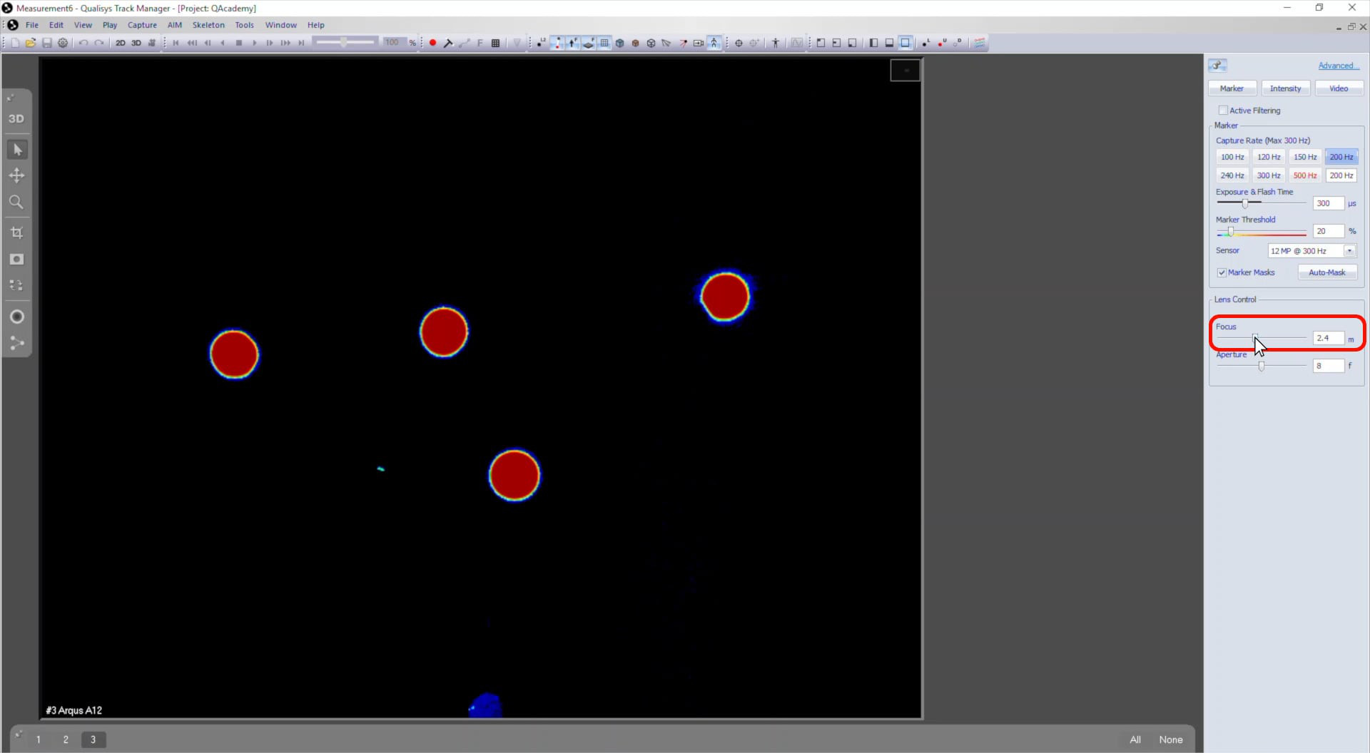 If you have a large recording volume, it may not be possible to get all of the markers in focus at once, so prioritize those nearest to the camera.