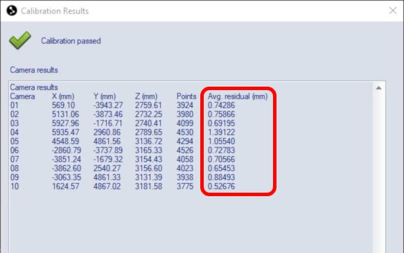 Check the points column, which shows the number of times during calibration that each camera saw the markers. Ideally, there should be large numbers of points, and they should be similarly high for each camera.