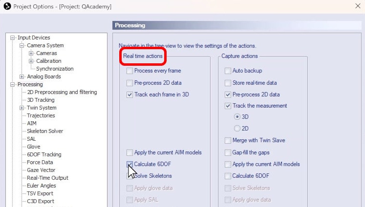 In the column under “Real time actions,” select all of the processing options that you want applied to your live or streaming data—for example, tracking each frame in 3D and calculating a 6DOF rigid body.