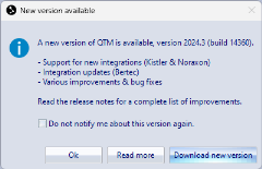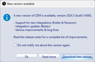 If there is an internet connection, QTM will automatically check for updates when it is started. You can also use the Check for updates option on the Help menu. When a new version is available, the New version available dialog is opened: