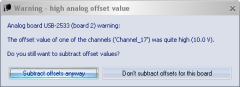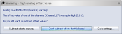 The offset compensation is activated for each analog board on its respective page, see chapter Compensate for analog offset and drift. The warning is always displayed at the end of a measurement if the offset is too high.