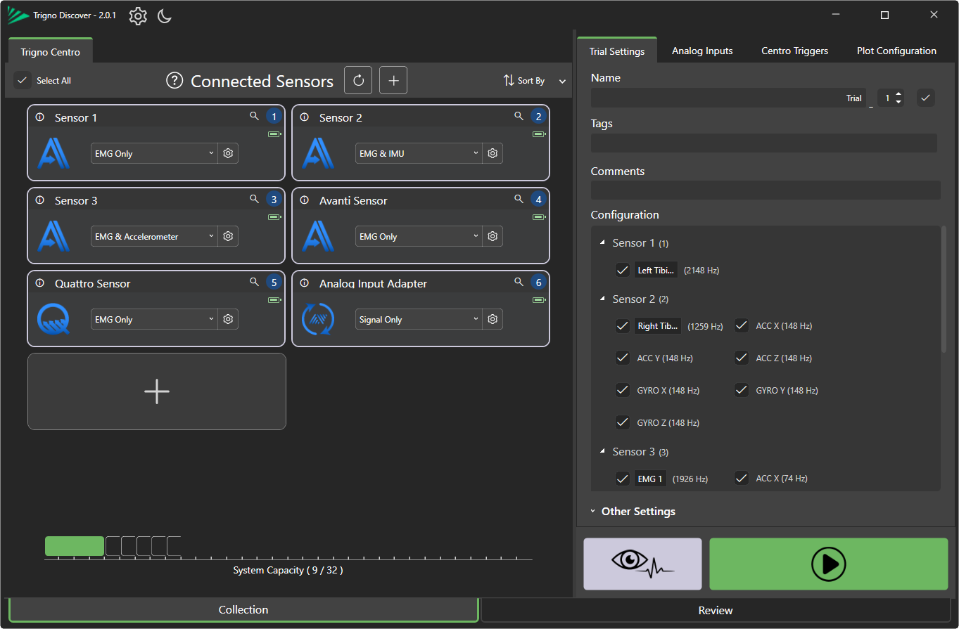 To stream or collect data with Delsys Trigno, simply start a preview or a capture in QTM.