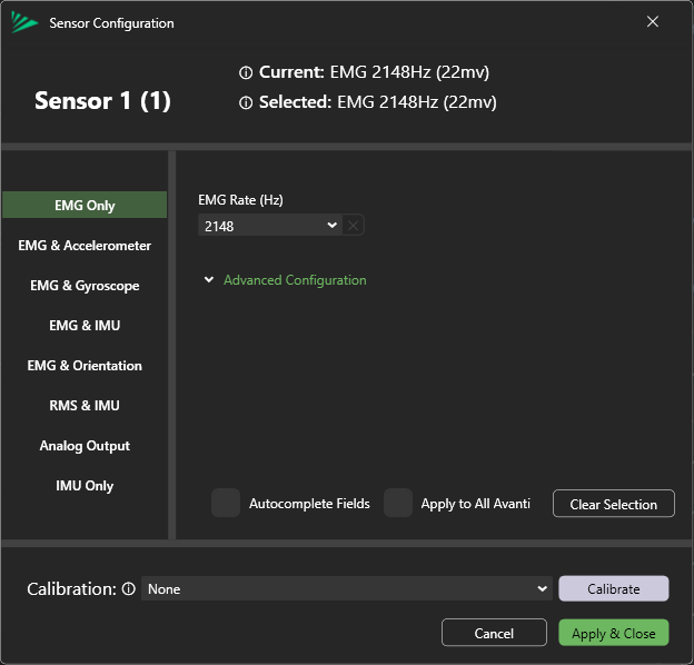 To choose the sensor mode, press the gear icon for a sensor, and specify the sensor mode and sample rates in the Sensor Configuration dialog.
