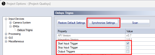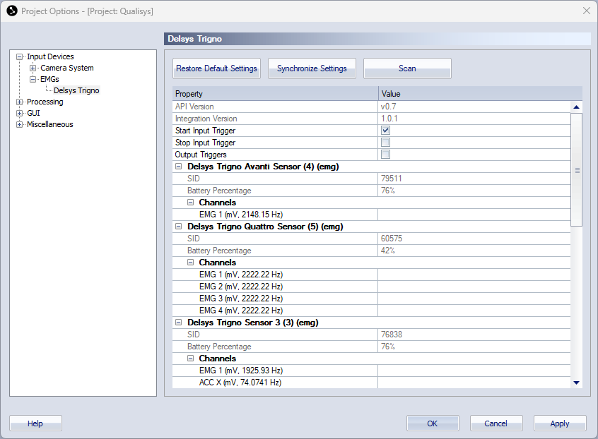 Open the Delsys Trigno settings page under Project Options > Input Devices > EMGs.
