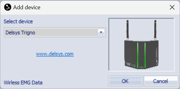 Click the Add Device button and select Delsys Trigno in the drop down menu.