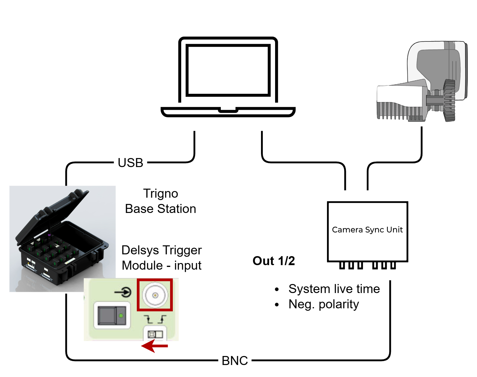 Connect the Out 1 or Out 2 port of the Qualisys Camera Sync Unit to the Trigger input of the Delsys Trigger module with a BNC cable.