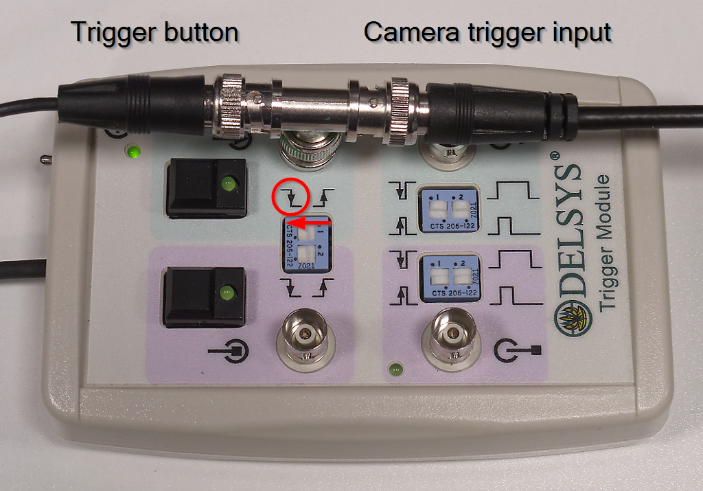 The green LED on the trigger button of the Trigger module lights up when the trigger signal arrives.