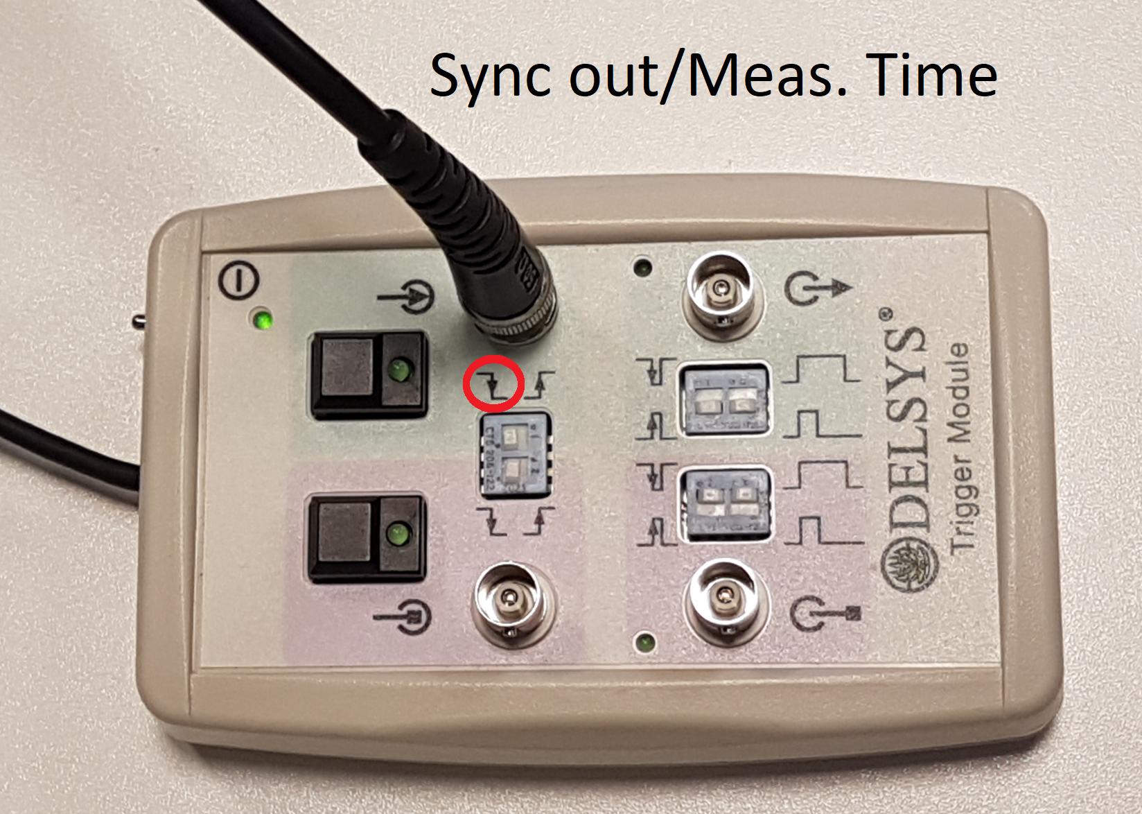 The green LED on the trigger button of the Delsys Trigger Module lights up when the synchronization start signal arrives.