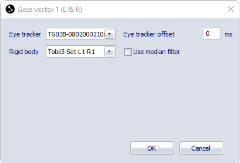 The Qualisys-Tobii connectivity kits for Tobii 2 and Tobii 3 include marker sets that can be attached to the glasses. QTM includes predefined rigid body definitions corresponding to the available attachments, that can be chosen from the rigid body drop-down list in the gaze vector definition dialog.