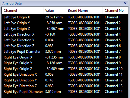 The eye tracker data from Tobii Pro Glasses 3 devices can be viewed in a Data Info window as Analog data. The eye tracker data for Tobii Pro Glasses 3 includes: