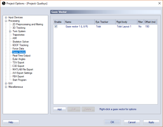 The Gaze Vector page contains a list of the current gaze vectors and the settings needed to calculate a gaze vector from the eye tracker data. Use the following options to modify the list.