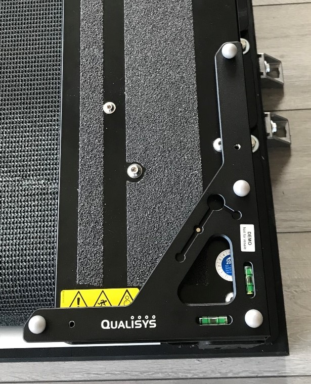 Set the location of the force plate. The recommended option is to press the Use default button to set the default location. This requires that the L-frame is placed at the origin of the tread mill at the rear right corner when calibrating the camera system, and that it is level with the Gaitway-3D surface. For alternative options, see chapter Force plate location.