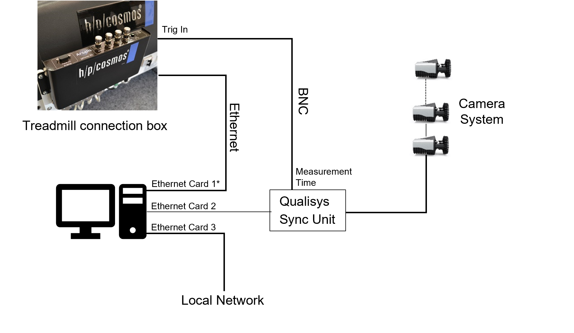 The treadmill can be connected to the same computer running QTM or a different computer connected through the same local area network (LAN). Most commonly, the Gaitway-3D amplifier is directly connected to a computer via an Ethernet adapter. When connecting to the same computer that is running QTM, make sure that it is not connected to the same physical network as the Qualisys camera system. -