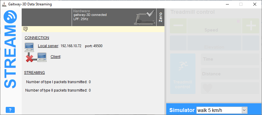 Press Stream data, and zero the force plate. This opens up a Gaitway-3D Data Streaming window with information about the connection.