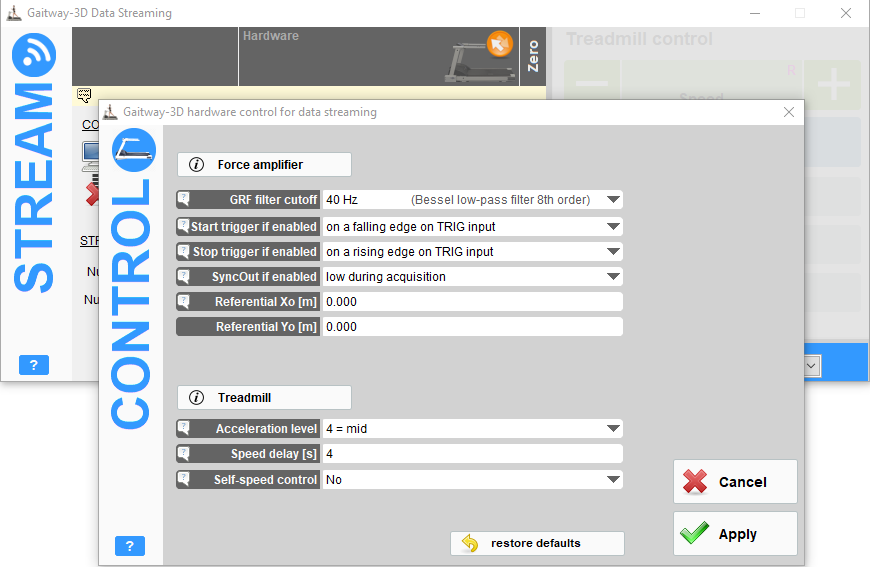 Once the Gaitway-3D data stream is set up, the treadmill can be added and configured in QTM.