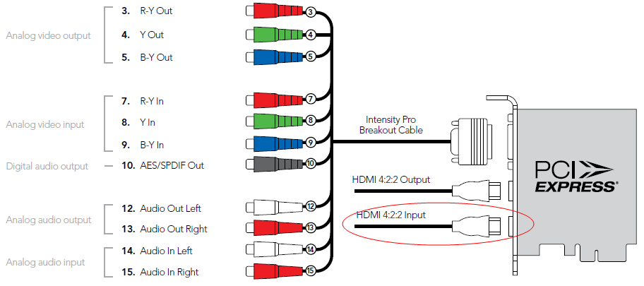 The Intensity Pro card can capture from different types of video sources (HDMI, Component, S-video and Composite). The card can also capture the sound on the HDMI input or from an analog RCA input. However it can only capture from one of the video inputs at a time so you have to follow these instructions when connecting a video source.
