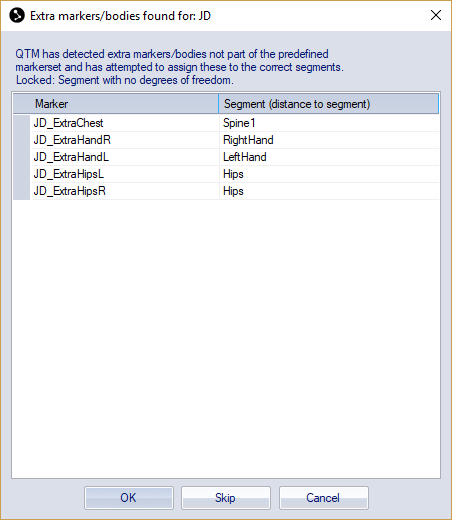 When calibrating a skeleton with extra markers or rigid bodies, QTM displays a dialog showing the assigned segments for each extra marker or rigid body. If needed, you can change the assignment to a different segment, or specify None if the marker or rigid body should not be used for skeleton solving. The functions of the buttons are: