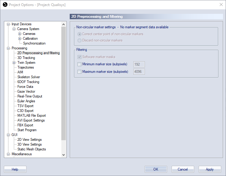 The 2D Preprocessing and filtering page contains settings for the preprocessing of 2D data before 3D tracking.