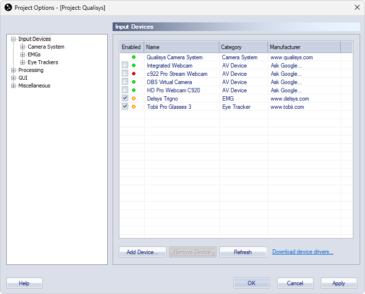The Input Devices page lists the available devices in QTM. Double-click on an entry to go to the settings for that device. The list contains the following information: