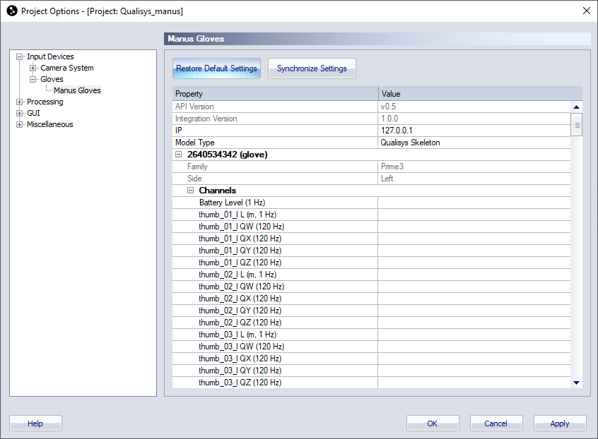 The Manus Gloves settings are managed via the Manus Gloves settings page. For information about how to connect and set up MANUS gloves for use with QTM, see chapter Connecting Manus gloves.