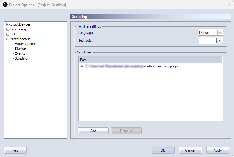 The Scripting page contains the settings for the terminal and the use of script files in QTM. For more information about the QTM Scripting Interface, see chapter QTM Scripting Interface.