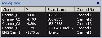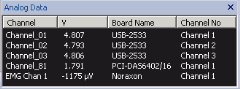 Click Display Analog data in the Data info window menu to show the analog data of the analog board in the Data info window. It will then show the data for the current frame in the following two columns: