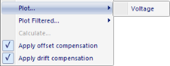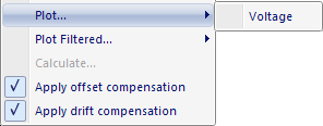 To plot the voltage, select one or more channels, click Plot or Plot filtered on the Data info window menu. With Plot filtered you can apply a Fit to 2nd degree curve or Moving average filter. For information about the Plot window see chapter Plot window.