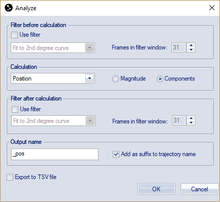 The Add as suffix to the trajectory name setting can only be changed when a single trajectory is selected. If more than one trajectory is selected and Position, Velocity or Acceleration calculations are performed, the setting is always selected. Otherwise all the results would have the same name. On the other hand, when Angle, Angular Velocity or Distance calculation is performed, the setting is always deselected, since there are two, three or four trajectories selected but the result is a single value.