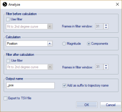 Filters can be applied both before and after the calculation, by selecting Use filter under the respective heading. Set the number of frames that are used for each point in the filter with the Frames in filter window option. The number of frames must have an odd value.