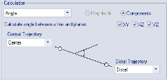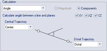 For two markers the angle is calculated between the line and the planes of the coordinate system. Select which planes you want to use with the checkboxes XY, XZ and YZ. The angle is calculated between -90 and 90 degrees. Which sign the angle has depends on how line from Center Trajectory to Distal Trajectory is pointing. For example if you are using the XY plane then the positive side is when the line from central is pointing in the positive Z direction.