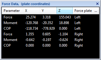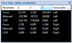 The Data info window will then contain data for the force plate's Force, Moment and COP (Center Of Pressure) vectors. The data is for the actual force on the force-plate. The displayed data is for the current frame in the following five columns: