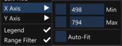 View or modify the respective axis settings. Edit Min or Max to set custom plot limits. Tick the check boxes for Min or Max to use fixed values for the plot limits, or Auto-Fit for automatically adapting to the data range. -