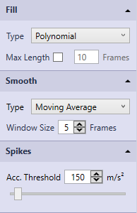 In the settings sidebar of the Trajectory Editor window you can select methods for gap filling and smoothing, and change their parameters. In addition, you can set the spikes detection level.