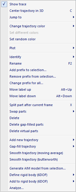 The Trajectory info window menu contains options for the tracked trajectories in a file. Most of the options are not available in real-time. The menu can be accessed by right-clicking in the following places: