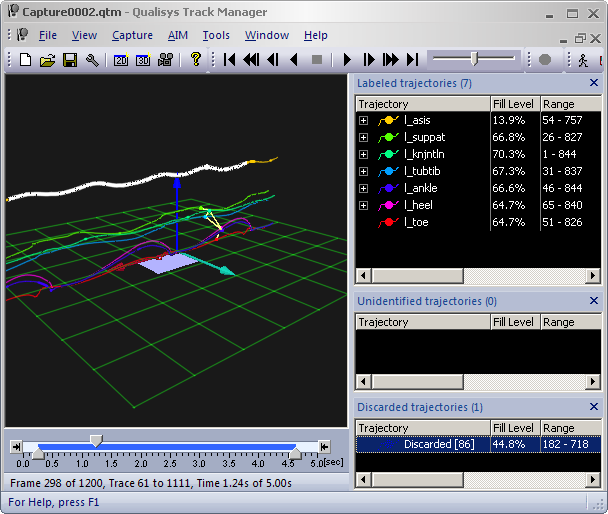 The trajectories in the Discarded trajectories window are not shown in the 3D view windows and are not included in exported data. To show a discarded trajectory and its trace in the 3D view, select the trajectory in the Discarded trajectories window, see picture below.