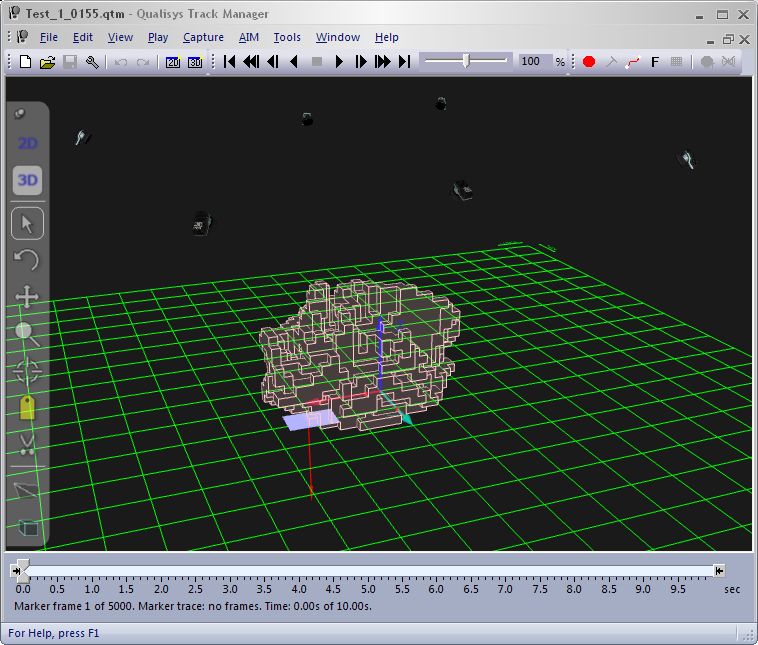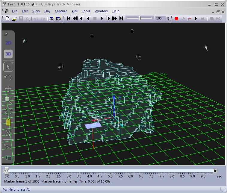 The calibrated volume is displayed as light red cubes. It is the volume that the wand moved through when the camera system was calibrated. It therefore indicates where the most accurate 3D results can be expected and can be used to evaluate if the wand needs to be moved in a larger volume. 3D data will however be calculated outside the calibrated volume as well. This is usually not a problem as long as the markers are within a few decimeters of the calibrated volume. Use the 3D residual to evaluate if the data is good enough.