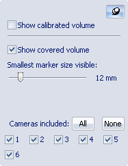 Select which cameras that are used in the calculation with the All/None buttons and camera check boxes. By choosing which cameras are considered when creating the covered volume, you can for example determine what happens to the volume when one camera is occluded. Another case that can be simulated is when the cameras are mounted on two sides and can only see markers on one side of the subject, e.g. on a human walking through the volume. Then you can turn off all of the cameras on one of the sides to see the volume where the subject can be viewed by the rest of the cameras.