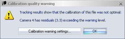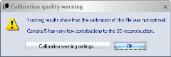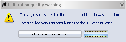 If the warning instead is about the camera having too few contributions, then you get the warning below. In this case the data is not used in the 3D tracking so the 3D data you have has not been degraded. However it is recommended to check the 2D data to see what the reason is and then calibrate the system.