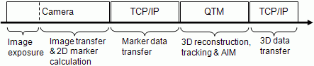 Real time latency is the time it takes from the marker exposure to the time when the TCP/IP signal can be received on another computer. The latency can be divided into the parts in the image below. The size of the different parts shows approximately how long time the different steps will take.
