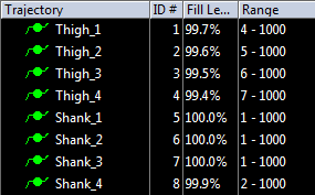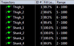 The IDs of the markers are displayed in the ID# column of the Trajectory info windows. QTM will automatically join all of the trajectories with the same ID. However you can manually join any trajectories with an ID with a trajectory with ID 0, by dragging the one with ID to the one without ID. The merged trajectory will get the ID of the identified trajectory. You can undo the merge with the Undo command. It is not possible to change the ID of an identified trajectory.